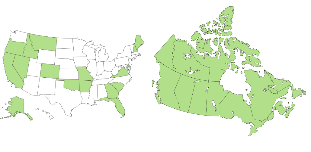 USA: Alaska, Arkansas, California, Colorado, Delaware, Florida, Georgia, Idaho, Maine, Missouri, Montana, Nevada, New Hampshire, Oklahoma, Oregon, South Carolina, Virginia.